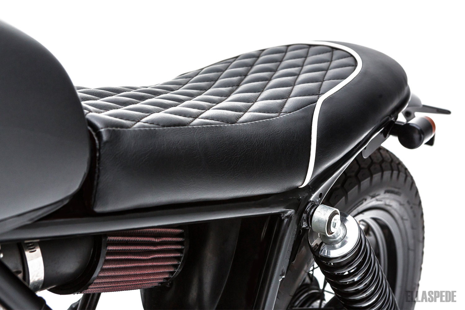 A full rewire with an under-seat electrics compartment hides the wiring to the Danmoto speedometer, Daytona indicators and LED flex tail light. Up the front a flat track inspired number board houses twin spots from an aftermarket enduro headlight, with internal wiring to the micro bar switches controlling the lights and sounds.