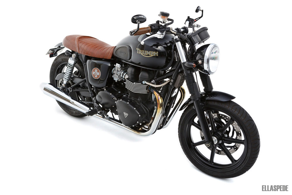 The obvious changes were the shortened frame, custom seat and seat colour, matched with Posh toffee grips. Custom painted graphics on the side covers (which relate to Brendan’s profession), a custom rear guard, lower handlebars and all-black rims. (we toyed with the idea of returning the Bonneville to spokes but decided to wait and assess how the powder coated mags turned out… thumbs up on that one.