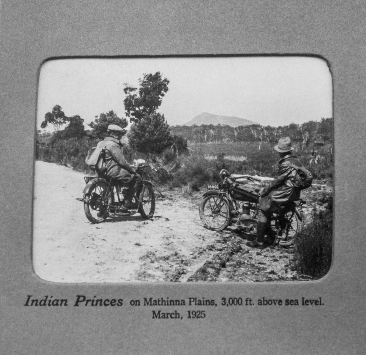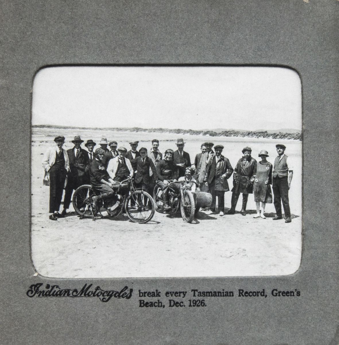 Other non-mounted photos include: King’s Champion Cycle Works employees circa 1911; (Herb King) rounding a bend on Elephant Pass 1914; Kate on Herb’s solo Indian circa 1914; Herb with a mate on solo Indians on Pine Lake road, 1915; George on his Indian outfit on a bad piece of Hellyer Road circa 1919 and Kate beside Herb’s Indian outfit in the snow, Pillingers Drive, Mt Wellington. Kate featured in the side-car: on East Beach in front of The Nut, Stanley circa 1919; on the road to Interlaken (early 1920) and on the road to Gunn’s Plains circa 1920.