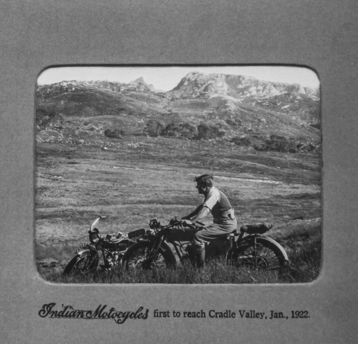 THREE ‘INDIAN’ MOTORCYCLES (RIDDEN BY H. J. KING, E. BONNER AND E. HODGSON) ARRIVED AT THE CRADLE FOR THE FIRST TIME.”