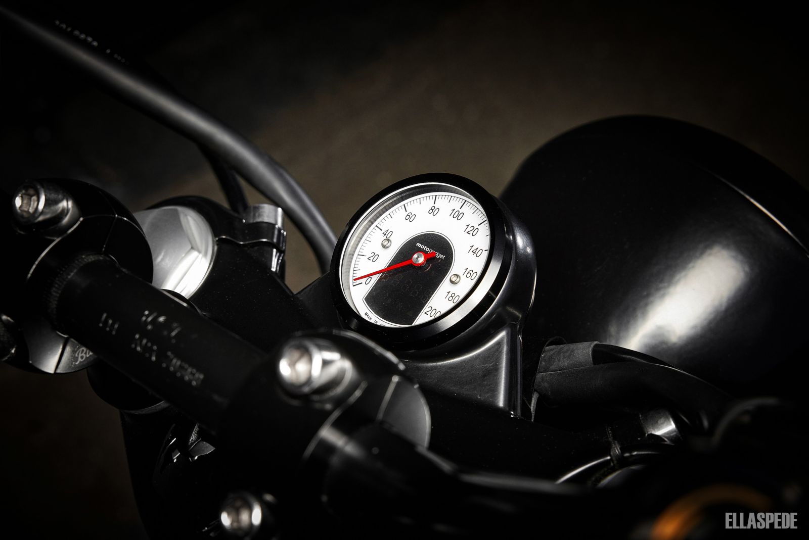 Moving further forward, the factory top triple tree was machined out to house the new Motogadget Motoscope Tiny gauge, with Biltwell risers and LSL Flat Track Lenker bars dropping in over the top. Kustomtech ‘seventies’ brake and clutch levers slide on with Motogadget M-Grip soft grips to provide premium touch points for the rider. A Domino Ride-by-wire throttle removes the need for the chunky stock throttle switch block as well.